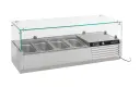 De gekoelde opzetvitrine is voor het bewaren van ingrediënten in gastronormbakken. Dit is bijvoorbeeld handig voor horecaondernemers die zich bezighouden met het verkopen van etenswaren als belegde broodjes. Door voor het opslaan en koelen van broodbeleg glazen opzetvitrines te gebruiken, kunnen de gasten in de betreffende horecazaak namelijk direct zien uit welke soorten broodbeleg men kan kiezen bij het kopen van een belegd broodje. De opzetvitrine is standaard voorzien van een glasopstand. De temperatuur is digitaal instelbaar. Wordt geleverd zonder GN-Bakken