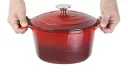 Deze mooie, rode pan is ideaal om vanuit de oven rechtstreeks te serveren aan tafel, voor een mooie presentatie van het gerecht.