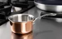 Mini sauspan met sandwichlaag van aluminium tussen twee lagen RVS en een koperen buitenlaag, voor een snelle en gelijkmatige warmteverdeling. Geschikt voor alle warmtebronnen, behalve inductie. De pan is voorzien van een geklonken handvat voor een betere grip, is vaatwasmachinebestendig, meet 5,5(h) x 9(Ø)cm en heeft een capaciteit van 0,33ltr.