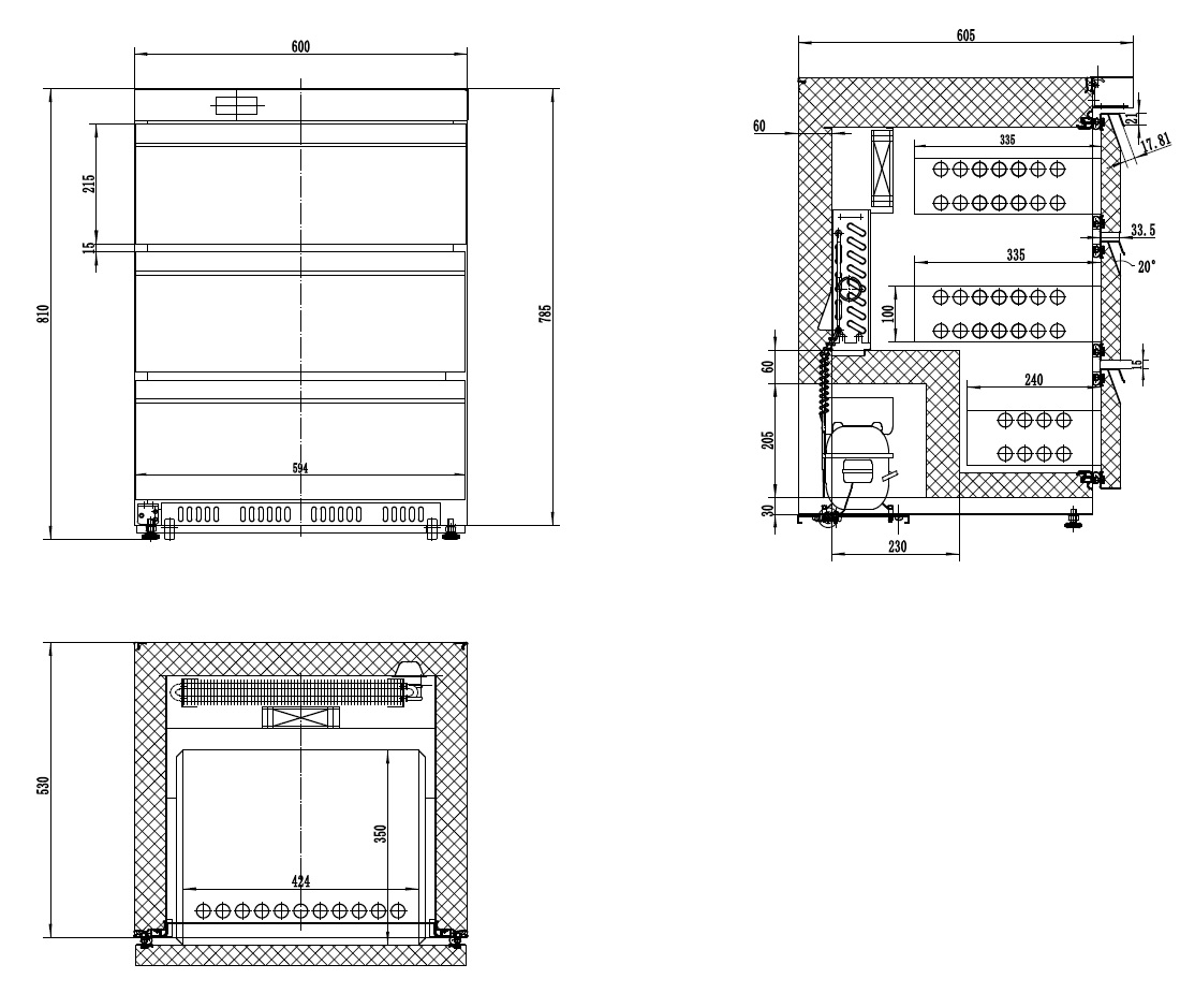 Koeling met 3 laden, automatische ontdooiing, RVS binnen en buiten, geforceerde koeling, energieklasse A.