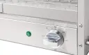 Handige RVS warmhoudvitrine, bij uitstek geschikt voor bakwaren. Hygiënisch en gemakkelijk te reinigen met glazen schuifdeuren voor gemakkelijke toegang. Interne lamp en waterpan voor behoud van luchtvochtigheid, zodat voedsel niet uitdroogt. Drie uitneembare schappen.